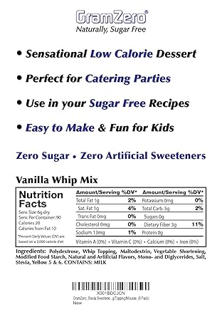 Sugar Free Whipped Topping Nutrition Facts - Eat This Much Sugar Free Whipped Topping Kraft Cool Whip - Walmart Find on Amazon Percent calories from... Quick stats 20 Calories 3g Carbs (3g net carbs) 1g Fat 0g Protein No price info Try our free Diet Generator I want to eat calories in meals. I like to eat Note: Any items purchased after clicking our Amazon buttons will give us a little referral bonus.