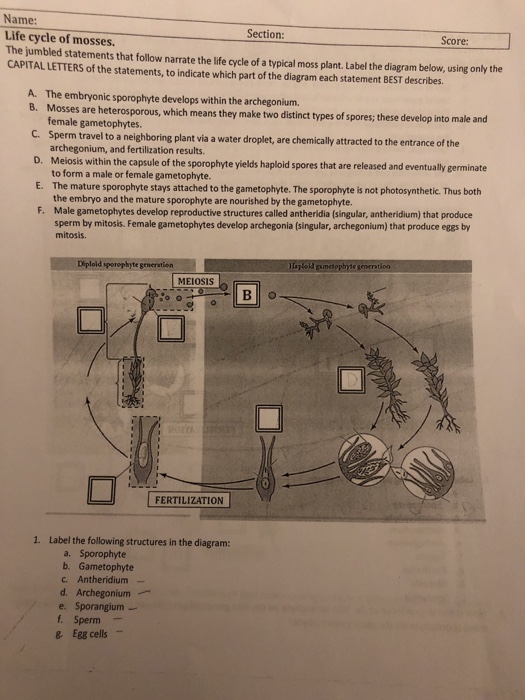 Primitive Plants: Mosses, Ferns, and Allies Labeled Moss with Sporophytes In wet weather, sperm are released from their antheridium, swim to an archegonium, swim down the opening in the archegonium, and fertilize the egg. The resulting 2n zygote remains within the archegonium for protection from dessication, and grows by mitosis to form the new, 2n sporophyte generation. Draw a diagram to describe the life cycle of the moss, pointing out ... Solution. The life cycle of most mosses begins with the release of spores from a capsule, which opens when a small, lidlike structure, called the operculum, degenerates. A single spore germinates to form a branched, filamentous protonema, from which a leafy gametophyte develops. The gametophyte bears organs for sexual reproduction. Moss Antheridia - Florida State University Moss Antheridia. Reproduction of mosses, an advanced group of the green seedless plants known as Bryophytes, may take many forms. New plants may develop through branching, fragmentation, regeneration, or production of spores. In the gametophyte form of mosses, reproduction is generally sexual and is seasonally controlled.