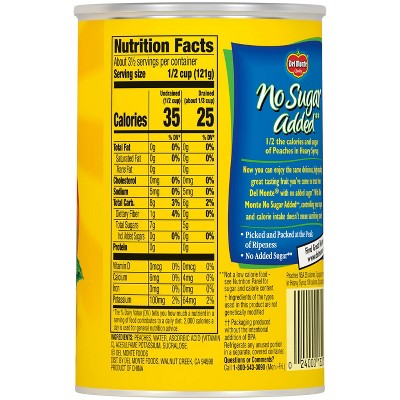 Nutrition Facts for Del Monte Lite Sliced Peaches Canned Nutrition Facts Serving Size cup 0.5 cup = 124g Amount Per Serving 60 Calories % Daily Value* 0% Total Fat 0g 0% Saturated Fat 0g Trans Fat 0g 0% Cholesterol 0mg 0% Sodium 5mg 5% Total Carbohydrate 14g 4% Dietary Fiber 1g Sugars 13g Protein 0g 0% Calcium 0mg 0% Iron 0mg 2% Potassium 100mg 2% Vitamin A 15mcg 4% Vitamin C 4mg *