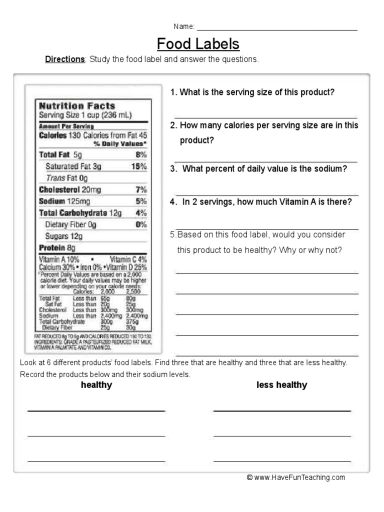 Food label questions worksheet
