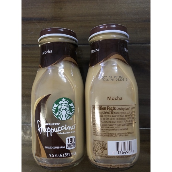 Calories in Starbucks Mocha Frappuccino (Bottle) and Nutrition Facts 33g. Protein. 7g. There are 190 calories in 1 bottle (281 ml) of Starbucks Mocha Frappuccino (Bottle). Calorie breakdown: 16% fat, 69% carbs, 15% protein. Starbucks Bottled Mocha Frappuccino Coffee Drink - Nutritionix Sep 25, 2017 ... Starbucks Bottled Mocha Frappuccino Coffee Drink. Starbucks. Nutrition Facts. Serving Size: fl oz. Amount Per Serving. Calories from Fat 27. Starbucks Frappuccino, Coffee, 9.5 fl oz (15 Count) Glass Bottles The product is labelled to United States standards and may differ from similar products sold elsewhere in its ingredients, labeling and allergen warnings Ingredients Brewed Starbucks Coffee (Water, Coffee), Reduced Fat Milk, Sugar, Maltodextrin, Natural & Artificial Flavor, Pectin, Ascorbic Acid. Legal Disclaimer Starbucks Caramel Frappuccino Chilled Coffee Drink 9.5 oz Bottles - H-E-B Product description With natural & artificial flavors. 200 calories per bottle. Pop the cap. Savor the sip. Go. Caramel Frappuccino chilled coffee drink is a blend of Starbucks coffee and milk swirling with caramelly flavor. For a sweet burst of delicious. A good source of protein and calcium. You're good to go.