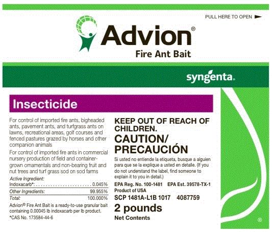 Advion Fire Ant Bait | Syngenta LLC | Agworld DBX | Greenbook View the product label for Advion Fire Ant Bait from Syngenta LLC. See active ingredients, product application, restrictions, and more at Agworld DBX, powered by Greenbook ... Advion Fire Ant Bait Syngenta LLC. Labels. Label SDS. Snapshot ID: 56950 Active ingredients Indoxacarb Classification. 22. Insecticide. WSSA mode of action Voltage ...