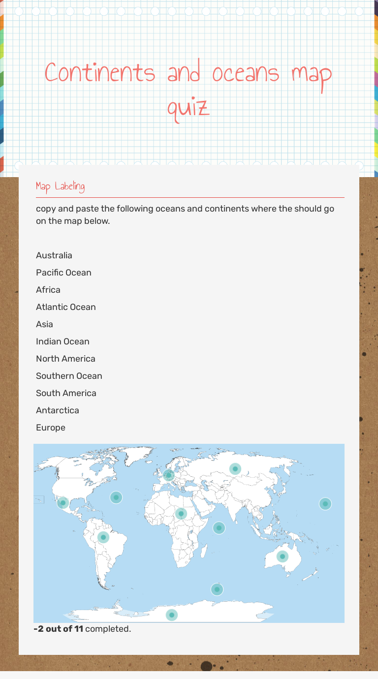 Continents and oceans quiz worksheet. World: continents and oceans quiz - Lizard Point The Southern Ocean was officially designated to be the 5th ocean by the International Hydrographic Organization (IHO) in the spring of 2000. A note on the CIA World factbook website says that "It should be noted that inclusion of the Southern Ocean does not imply recognition of this feature as one of the world's primary oceans by the US Government." Continents and Oceans Quiz - PurposeGames.com About this Quiz This is an online quiz called Continents and Oceans There is a printable worksheet available for download here so you can take the quiz with pen and paper. Mr. Nussbaum - Continents and Oceans - Online Game Continents and Oceans - Online Game This fun online game requires students to drag and drop the labels for the seven continents and the five oceans while the Earth is spinning. It is LOTS of fun, however, the game is very particular about where the labels are dropped. Continents and Oceans Worksheets - Free Word Search, Quiz and ... Get your free printable Continents and Oceans Worksheets here —> Blank Map Template. Get the. Get the Free Printable Continents and Oceans Worksheets. We prepared two versions, one with 5 oceans and one with 4 oceans so grab the set that is in line with your schools curriculum. Both sets include: continents and oceans word-search puzzles