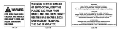 Suffocation Warning Labels, Suffocation Warning Stickers in Stock - ULINE Suffocation Warning Labels. Caution against child suffocating hazards. Use with lightweight poly bags. Gloss white paper with permanent adhesive. S-20795 - Large 24pt. font. S-20796 - Message printed in English, Spanish, and French.