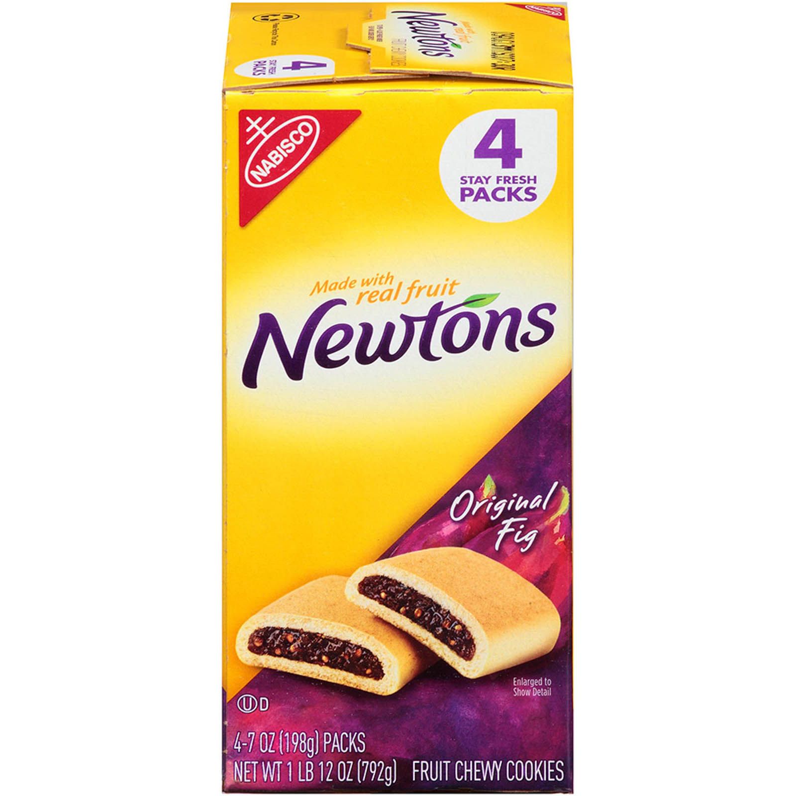Calories in Nabisco Newtons, Fig - Menu With Nutrition There are 100 calories in 1 cookie (30 g) Nabisco Newtons, Fig; click to get full nutrition facts and other serving sizes. Nabisco newtons cookies fig fat free1x12.000 oz by Mondelez Int. US ... Nabisco newtons cookies fig fat free1x12.000 oz by Mondelez Int. US (0074819091009) nutrition facts and analysis. Menu Search Home Nutrition calculator Compare ... Nabisco newtons cookies fig fat free1x12.000 oz by Mondelez Int. US (0074819091009) nutrition facts and analysis per (29.0 g) Vitamins; Nutrient Amount DV; Nabisco Newtons, Fruit Chewy Cookies, Fig Nutrition Facts Nabisco Newtons, Fruit Chewy Cookies, Fig Ingredients. Nabisco Newtons, Fruit Chewy Cookies, Fig contains the following ingredients: Figs, whole grain wheat flour, invert sugar, unbleached enriched flour (wheat flour, niacin, reduced iron, thiamine mononitrate {vitamin b1}, riboflavin {vitamin b2}, folic acid), corn syrup, sugar, vegetable oil (soybean and/or canola and/or palm and/or ...