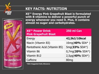 Drink Information - XS Learn - XSGear XS ® Energy Drinks are the leaders in great tasting, low calorie, premium energy drinks! In this section you'll learn about the variety of unique flavors, the different energy categories and the ingredients that fuel them. You'll also find downloadable product information sheets for each flavor and links to directly purchase each XS product.