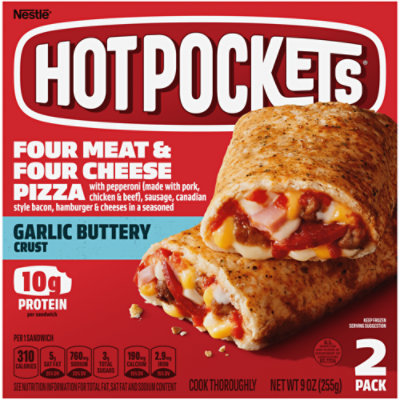 Hot Pockets Pepperoni Pizza with Garlic Buttery Seasoned Crust - 2 ct Premium pepperoni pizza with reduced fat mozzarella cheese in a seasoned garlic buttery crust. 10 g protein per sandwich. Per 1 Sandwich: 310 calories; 5 g sat fat (25% DV); 830 mg sodium (36% DV); 3 g total sugars; 220 mg calcium (15% DV); 2.5 mg iron (15% DV). See nutrition information for sat fat and sodium content. Good Source of Protein.